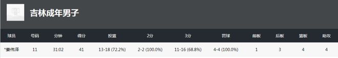 吉林全运男篮首胜的头号功臣,自然是姜伟泽迎来大爆发表现。此役,姜伟泽首发出战31分02秒,贡献18中13超过7成的投篮命中率,其中三分16中11高达接近7成准星,外加罚球4中4,一人狂轰41分4篮板4助攻无可阻挡。