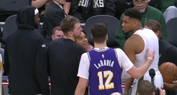 没想到,最后,还是字母哥看到了这一幕,他走过来一把把球拿过来,送给了东契奇。